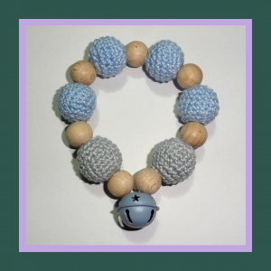 Alapanyag: sima és körbehorgolt fa gyöngy,csörgő,pamut zsinór